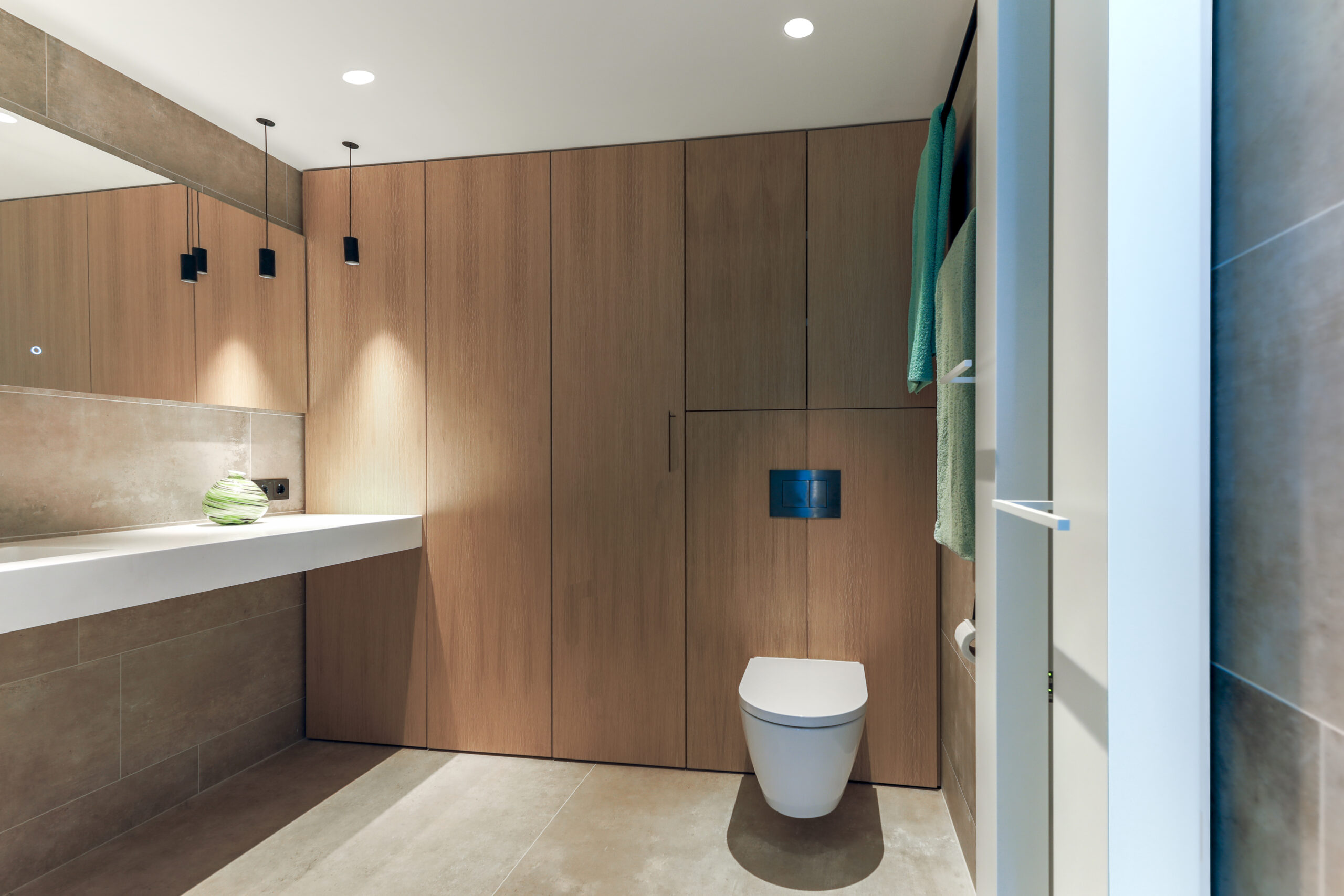 De op maat gemaakte inbouwkasten bieden niet alleen praktische opbergruimte, maar dragen ook bij aan de strakke en rustige uitstraling van het geheel. Het Rexa wastafelmeubel vormt een elegant middelpunt, met een verfijnde afwerking en een tijdloos design.