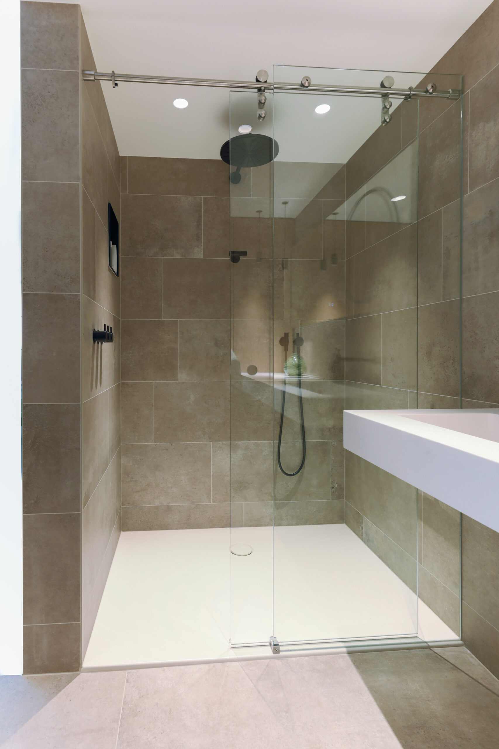 In dit project is de badkamer volledig vernieuwd tot een stijlvolle en eigentijdse ruimte waarin design en functionaliteit perfect samenkomen. De blikvangers zijn de zwarte inbouwkranen van Vola, die met hun minimalistische vormgeving zorgen voor een krachtig en modern accent.