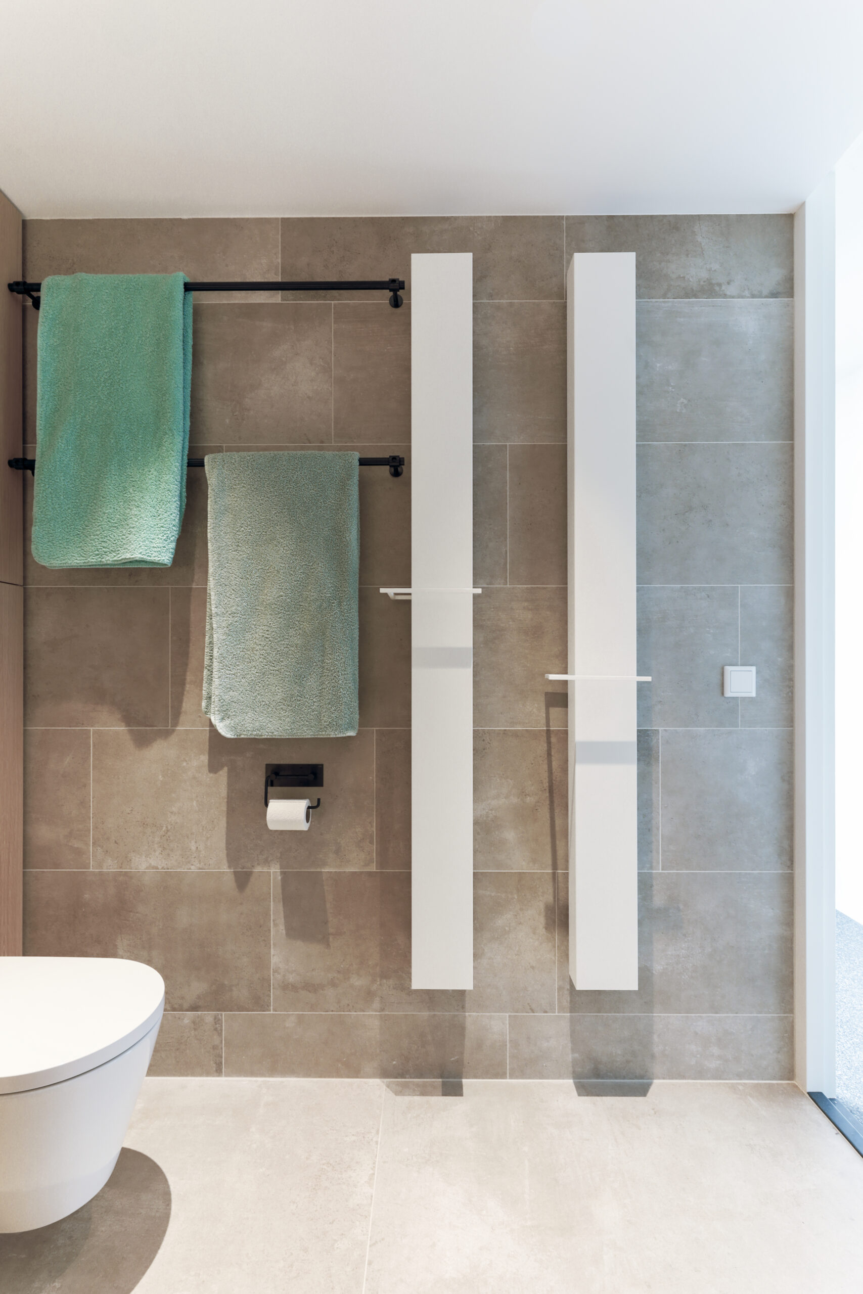 Voor extra comfort is gekozen voor elektrische radiatoren van Vasco, die zowel functioneel als esthetisch bijdragen aan de ruimte. De neutrale tegels zorgen voor een rustige basis en laten de zwarte accenten en materialen optimaal tot hun recht komen.