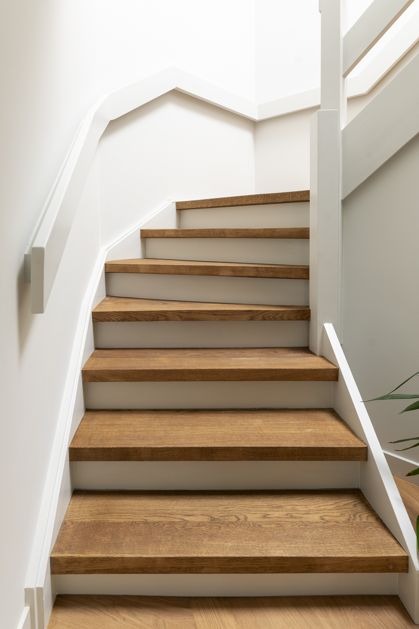 Op de begane grond is gekozen voor een open en lichte basis. De bestaande buitengevelkozijnen zijn vervangen door nieuwe schuifpuien, waardoor binnen en buiten naadloos in elkaar overlopen. Tussen de woonkamer en de gang is een nieuw kozijn geplaatst voor een betere indeling en meer samenhang. Daarnaast is er een compleet nieuw toilet gerealiseerd. De basis van deze verdieping wordt gevormd door een nieuwe vloercombinatie van hout en tegels, voorzien van vloerverwarming voor optimaal comfort. Ook zijn alle aansluitingen voor de keuken, elektra en verlichting volledig opnieuw aangelegd, klaar voor eigentijds gebruik.
